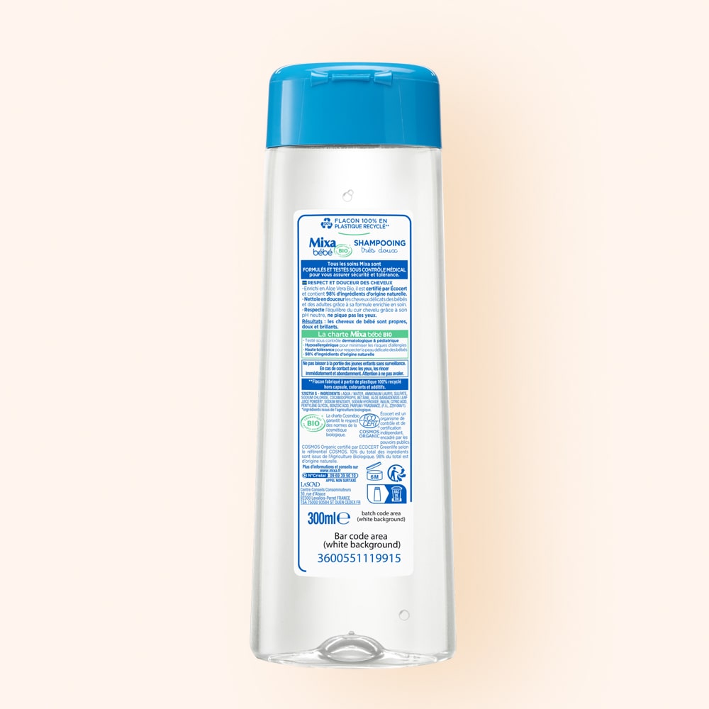 Ce shampooing, enrichi en Aloe Vera Bio, est certifié par Écocert et contient 98% d’ingrédients d’origine naturelle. Il nettoie en douceur les cheveux délicats des bébés et des adultes grâce à sa formule enrichie en soin, et respecte l’équilibre du cuir chevelu grâce à son pH neutre. Ne pique pas les yeux. Testé sous contrôle dermatologique & pédiatrique, ce shampooing est hypoallergénique et haute tolérance.