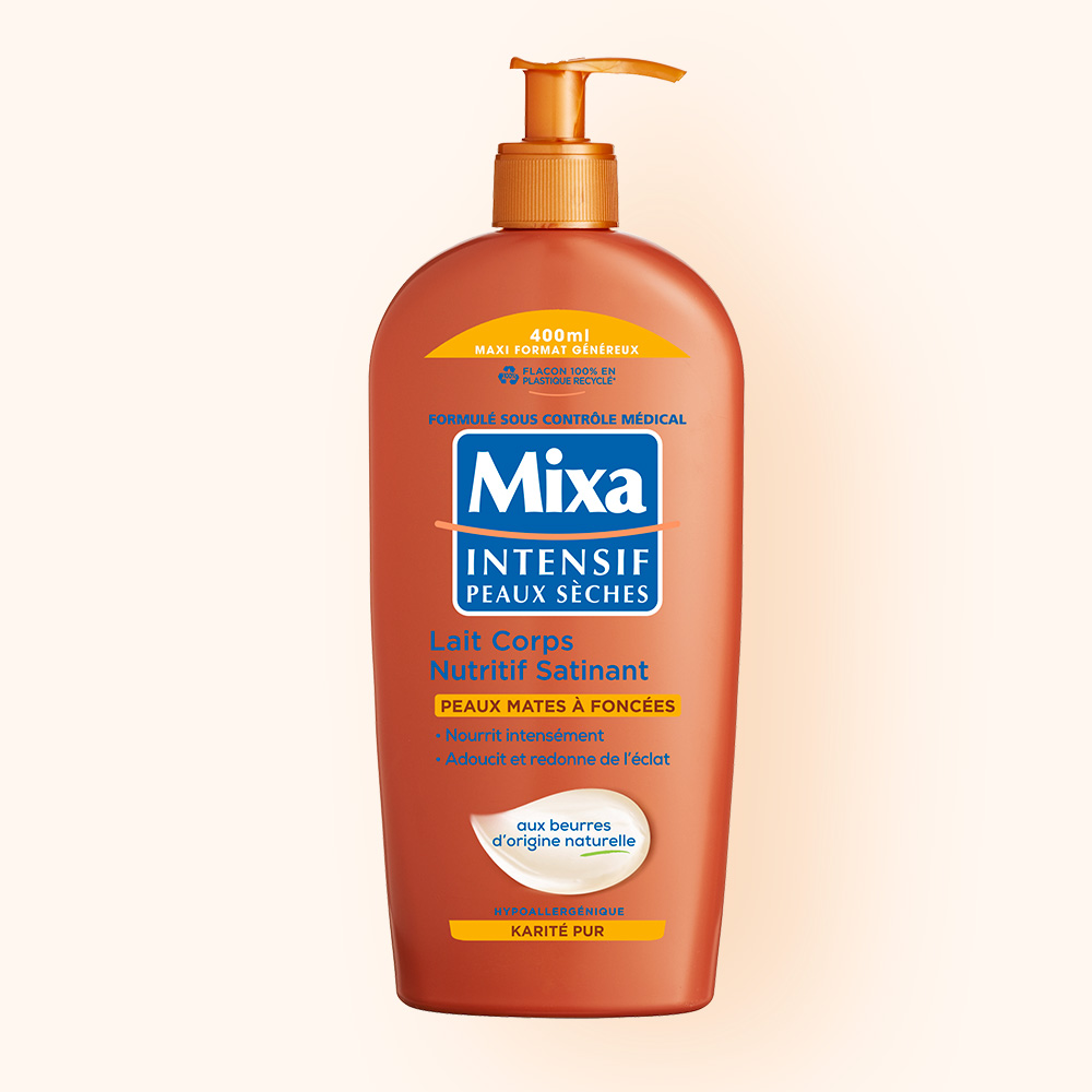 Le Lait Corps Nutritif Satinant de Mixa au Karité spécialement conçu pour nourrir les peaux mates à foncées.
