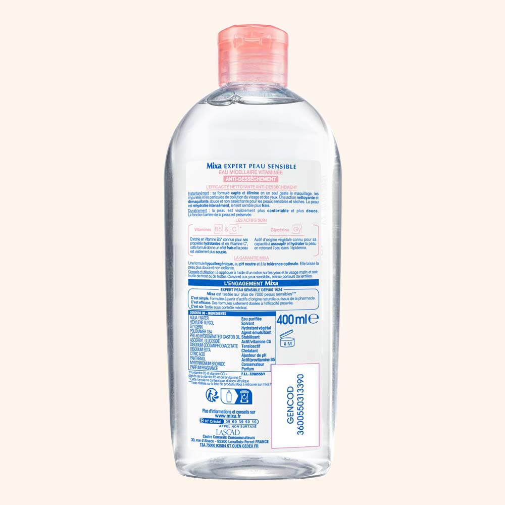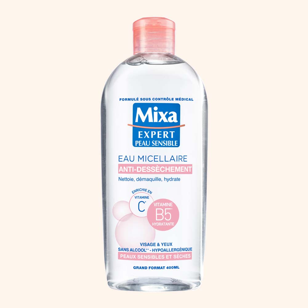 Mixa crée sa 1ère Eau Micellaire Vitaminée pour nettoyer les peaux sensibles et sèches dans le plus grand respect. Sa formule capte et élimine en un seul geste le maquillage, les impuretés et les particules de pollution du visage et des yeux. Une action nettoyante et démaquillante, douce et non asséchante pour les peaux sensibles et sèches. La peau est réhydratée intensément, le teint semble plus frais.